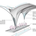 La propuesta diseñada por ShoP Architects referencia su forma de las estaciones de trenes tradicionales: columnas que soportan techos abovedados, los espacios abuhardillados que evocan imágenes de grandeza, una firmeza y la solidaridad que resuena con su entorno. La estructura con forma de tienda de campaña, va más allá de la plataforma que abarca el espacio urbano circundante, rompiendo libremente con el estrecho y restrictivo sitio. Las chimeneas solares de 100 pies de alto proporcionan un alivio del calor y ofrecen ventilación natural ayudando a la circulación del aire. La forma de las chimeneas dirige el agua de la lluvia para que no interrumpa el flujo de pasajeros.