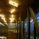 Al haberse proyectado la estructura soportante de color negro, da la sensación de que ésta se pierde en la oscuridad a modo de silueta en la noche y se destaca aún más el volumen vidriado iluminado desde dentro, que se enciende como si fuere una linterna. Se ha planteado bajo los aleros, una serie perimetral de focos alineados, iluminados con tubos fluorescentes compactos de bajo consumo energético. Éstos, al estar alineados con las luminarias preexistentes, cumplen el rol de realzar la condición de remate del edificio hacia la esquina y de enfatizar el espacio intermedio generado por la doble piel arquitectónica. En el interior se ha proyectado una grilla de tubos linestra con contacto central, permitiendo que puedan ser instalados rotados con respecto a este eje de contacto y dar una sensación más lúdica, ya que, mirando desde dentro los reflejos de éstas en el vidrio, se superponen a la imagen de los ramajes de los árboles de la plaza como si las luces formaran estructuras arbóreas mas abstractas superpuestas a los árboles reales. Del mismo modo el reflejo construye la ilusión óptica de un horizonte que pareciera que se extiende mas allá, llegando casi hasta las fachadas que se encuentran al otro lado de la calle.