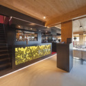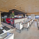 Se generó una magnífica vista desde el restaurante por el levantamiento del volumen edificado. Esta intervención da lugar a un espacio de almacenamiento de 6 corbetas debajo del restaurante. Mediante el uso de una construcción duradera y prefabricada de elementos de madera laminada, el tiempo de construcción se reduce significativamente.