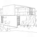 Ambos prismas están encerrados como limites entre área interna e externa por dos pórticos paralelos entre si y perpendiculares a la calle, sin embrago, conectados por un pasaje abierto (el patio elevado) y otra elevada cubierta y cerrada (puente metálico) que une los siguientes programas afines, el primer pórtico, mas próximo a la salas de estar y comedor respectivamente.