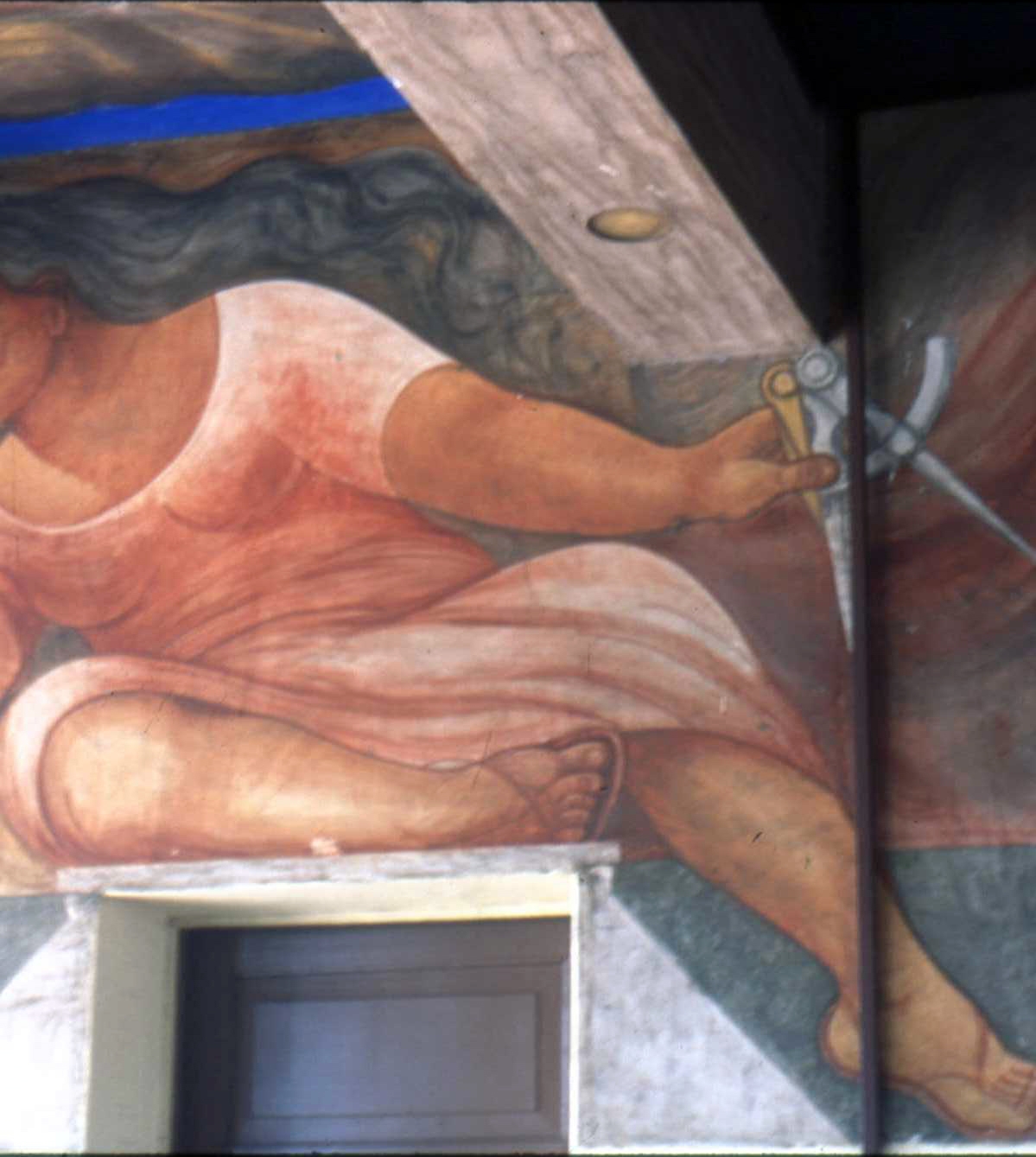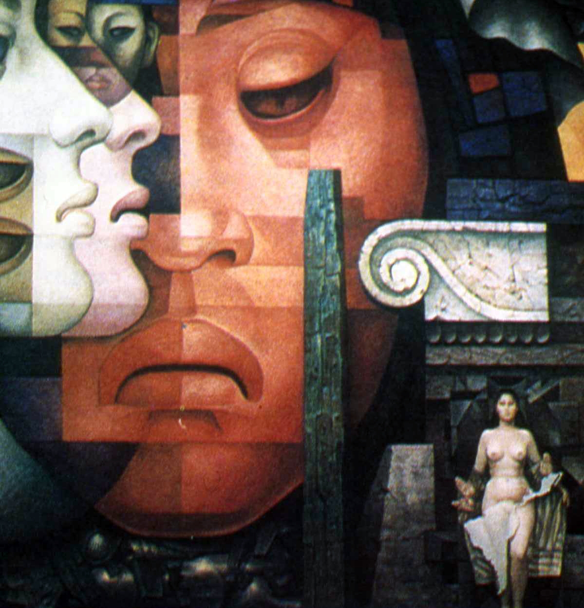 Mural “Presencia de América”, del mexicano González Camarena, U de Concepción. Fuente: Catálogo de la pinacoteca de la U de Concepción, 1992. Lo humano y lo divino se unirán a partir de ello, y los argumentos visuales muestran hasta hoy, un catálogo cuyos elementos indexicados dejan ver asuntos como los “rompimientos de gloria” en murales cuya composición ilusoriamente genera perspectivas arquitectónicas y paisajísticas inexistentes. A lo anterior se suman todas aquellas obras pintadas en bóvedas y techumbres en donde los personajes se muestran mirando al espectador que yace abajo, algunos de ellos sentados en el borde con su pies colgando hacia la mirada de ese sujeto. (Barroco-Rococó). Con todo lo anterior se crea una re-presentación del universo cósmico-metafísico cuyas efigies antropomorfas cumplen la función de narrar aquellos elementos más representativos asociados a la historia sagrada o profana, y esta última a su vez vinculada al sentido de las edificaciones. Algo diferente es el caso en donde la pintura y la arquitectura se emparentan bajo el discurso político. Para ello sirva como ejemplo el Muralismo Mexicano de las primeras décadas del siglo XX. La tríada formada por Ribera, Orozco y Siqueiros constituye la muestra más representativa de esta estética latinoamericana. A ellos habrá que sumar las obras de González Camarena, de las cuales existe una en Chile (Pinacoteca de la U. de Concepción), como también los murales de Xavier Guerrero, los cuales acompañan al que realizó Siqueiros en la Escuela México de Chillán . Los enlaces de arquitectura y pintura en las últimas décadas, además de haber variado las técnicas, han diversificado la forma y el contenido del discurso. El recinto arquitectónico alberga por medio del muralismo, distintas “voces” pictóricas.