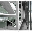 En consecuencia, reserva la circulación organizadora del programa (en triple altura) incorporándola a la plaza interior de la Facultad, de carácter transparente, íntimo y escala más familiar, recogiendo y reinterpretando la distribución de los edificios antiguos de la Facultad.