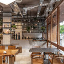 En el interior, una serie de pórticos con equipamiento variado vinculan el programa de la barra —que incluye la caja de atención, exhibición de comida y retiro de pedidos— con el área de asientos, de distintos tipos. La disposición longitudinal de la barra permite una visualización completa del proceso de preparación de los platos, involucrando al cliente en la experiencia y conectando la atención al cliente con la producción. El espacio interior se expande hacia el fondo, creando un área más cómoda para las mesas, funcionando de fuelle con el patio exterior.