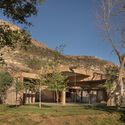 Descripción enviada por el equipo del proyecto. La estructura diseñada para albergar múltiples eventos sociales de carácter corporativo se ubica en un paraje especial, en el límite de la mancha urbana entre el río Sacramento y la Sierra de Nombre de Dios, y se concibe como un habitáculo que se integra y enmarca el paisaje. El pabellón se asienta en la falda del cerro, junto a un muro de mampostería preexistente, entre árboles de gran tamaño y sobre un terraplén conformado para nivelar y elevar las vistas hacia el entorno.