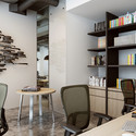 En el privado del CEO, se diseño un librero de concreto aparente, que se integra de nuevo a la trama del cielo expuesto.