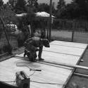 Para sentirse a gusto cuando la capilla esté colmada, se levantó la cubierta en una de sus aguas, permitiendo el paso de aire sobre las cabezas de los ocupantes. Un paño traslúcido en sentido longitudinal se dispone en el oriente para introducir la luz de la mañana y se habilita un portón de corredera de esqueleto metálico, revestido en su cara interior con paneles de melamina y en su cara exterior con tabla machihembrada protegida de la humedad con carbolineo, el cuál puede abrirse con total confianza, y que conectará el interior de la capilla con el patio, permitiendo recorrerlo, ocuparlo o sencillamente dispersarse.