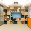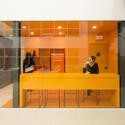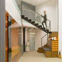 El espacio de doble altura permite la conectividad entre los dos pisos de la oficina, y garantiza una iluminación adecuada, dándole una mayor amplitud a la oficina. El pabellón se compone de elementos de color naranja que reproducen el color principal de la marca, creando una identificación directa y explícita en el espacio.