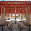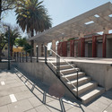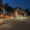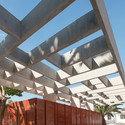 Importante infraestructura de extracción de agua en la porción sur de la plaza condicionó una plataforma elevada que funcionará a manera de foro-terraza, confinada por un salón de usos múltiples y un espacio para vigilancia permanente. Los componentes del conjunto se articulan a través de una pérgola escultórica de concreto que provee sombra y refugio y brinda una imagen singular y memorable al conjunto.