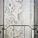 Este plafón de cristal requirió de un trabajo constante con el arquitecto, sobre todo al momento de decidir hasta que punto tendría que ser traslúcido, ya que es la única entrada de luz. Elaboramos ocho maquetas y, aunque varias me gustaron más que la pieza final, llegamos a la conclusión de que las otras eran inviables porque impedían el paso de suficiente luz. Entonces calculamos un porcentaje, veinticinco por ciento oscuro y setenta y cinco claro, para que el plafón proyectará la luz necesaria para la lectura. El dibujo lo creé a partir de la figura de una hoja de bambú que se transformó en una escritura primitiva, una traducción de la planta a la escritura.
