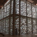 En este proyecto, representé la selva Lacandona en su forma más primaria, simple y pura, sobre la fachada del edificio. En un viaje por la selva, decidí recoger los materiales más pequeños y así comencé a recolectar semillas; cuando me di cuenta de que todas eran distintas, pensé que podían formar una especie de alfabeto primitivo. Las semillas impresas sobre el cristal templado, en positivo y negativo, parecen encapsuladas a la espera de ser sembradas y así transformarse en árboles, plantas y frutos. Esta idea se relaciona con los estudiantes que se forman y desarrollan en una escuela de diseño.