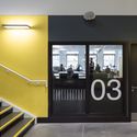 El interior de Atrium Studio ha sido diseñado para proporcionar una solución robusta para un ambiente de aprendizaje. Además, como la especialización de la escuela es la construcción, gráficos informativos se han incorporado en el diseño; los estudiantes y los visitantes podrán ver la carga sobre cada elemento estructural y el plan de la escuela constituye el patrón de la balaustrada de la escalera. A lo largo del edificio, livianos y amplios espacios se han creado mediante el equilibrio de la estructura expuesta con toques de color brillante.