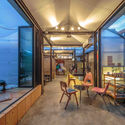 La zona de estar elevada a un lado del edificio se abre a la calle, lo que permite disfrutar un ambiente al aire libre y una sensación de apertura y conexión con el barrio que la rodea.