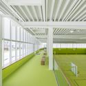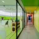 Descripción enviada por el equipo del proyecto. Cuando entras en el centro deportivo Neumatt, lo primero que captas es su energía y vitalidad. No viene sólo de los niños que juegan al baloncesto en un espacio que está inundado por luz natural, sino también del piso y paredes verde brillante que conducen a grandes ventanas que reflejan el azul del cielo y las puertas de colores de los vestuarios, pintadas como el arcoiris en tonalidades de amarillo, rojo, naranja y azul.
