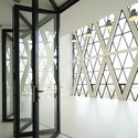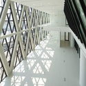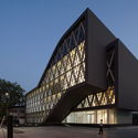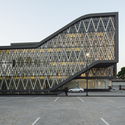Desde el centro, parece ser una típica estructura de hormigón con columnas y losa plana. La distribución de la carga se transfiere a la fachada, donde un patrón enrejado, como una súper armadura de sección de acero, lleva todo el peso hasta el suelo. Es nuestro primer intento de integrar hormigón y acero en un marco estructural. Con el gran estanque que refleja, la estructura parece estar flotando. El patrón de triángulos de la fachada se ha convertido en el detalle del principio que se aplica en todo el proyecto, desde la fachada acristalada hasta otros detalles, incluyendo el dispositivo de iluminación y el diseño de la cerca.