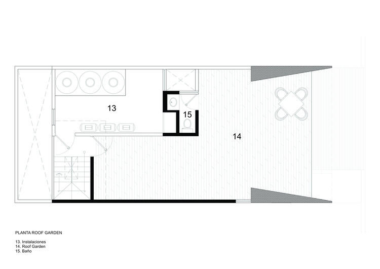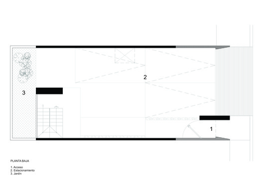 El edificio se compone de 5 niveles. En la planta baja se localizan el acceso, cochera para 4 autos, jardín y cubo de escaleras. En los niveles 1, 2 y 3 están los departamentos y en el nivel superior —el cuarto— está el roof garden equipado con un medio baño y donde también se designó el área de las instalaciones.