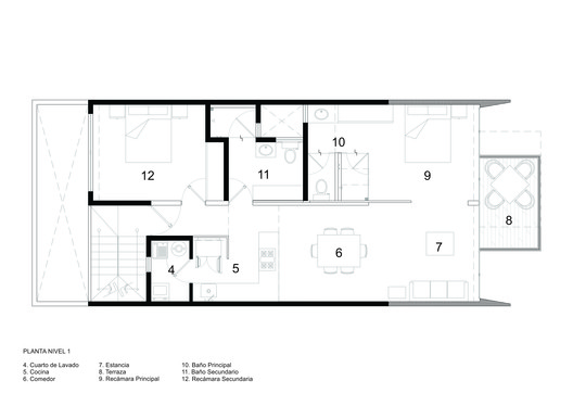 El concreto aparente es el principal acabado y define la personalidad contemporánea del proyecto. También se utilizó madera como elemento estructural y en algunos acabados para darle el toque de calidez necesario para los espacios residenciales. Todos los departamentos cuentan con sala comedor, cocina, dos recámaras, dos baños completos, terraza y cuarto de lavado.