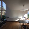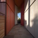 Un soporte entre los cubos divide las dos casas, creando una especie de callejón privado. No hay estacionamiento en el primer piso. Los autos son estacionados en el sótano con un elevador de autos.