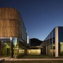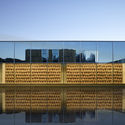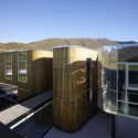 En el centro del complejo en forma de C, el bloque -levantado sobre pilotes que dan a una piscina y que recoge agua de lluvia- tiene fachadas de aluminio y madera de castaño, conocido por su resistencia a la humedad. En el techo, hay paneles fotovoltaicos y colectores solares.