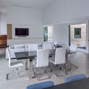 Una pared involucra los volúmenes de vidrio para crear un tope visual entre los pabellones de dormitorios y salas de estar. El ingreso a los pabellones es a través de las cajas de vidrio.
