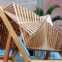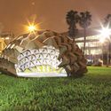 Como parte del programa de fin de año de la universidad, un grupo de estudiantes se asoció con una firma local de ingenieros para levantar un nuevo pabellón. La tarea consistía en demostrar los beneficios del diseño paramétrico y la fabricación digital mediante el diseño de un método constructivo de bajo costo pero estructuralmente eficiente. A través de una estructura dinámica de doble curvatura, el pabellón se construye de tiras rectas de 6 milímetros de madera contrachapada de abedul, que se tejen juntas a lo largo de geodésicas.