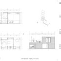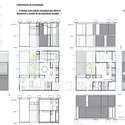 Debido a las medidas se opta por un modelo de crecimiento vertical de cuatro módulos en planta baja más dos en primera planta. Dos módulos exteriores, uno con galería exterior y parrilla, otro con lugar para estacionamiento. En planta baja, ámbito de estar con escalera y comedor con cocina, despensa, lavadero y toilette. Primer nivel, módulo dormitorio con baño integrado, módulo escalera con escritorio y doble altura con depósito para libros y discos. También se dispone un acceso a la terraza.