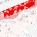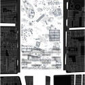 Extracto de memoria: Entenderemos la pieza a trabajar como el contexto próximo o perimetral de la estructura del mercado La Vega, tomando su condición habitacional y ocupacional del espacio público. La evolución de este perímetro en el siglo XX desde la aparición del mercado ha ido variando esde estructuras de habitación de buen estándar, espacios de producción y otros, a un barrio dormitorio de inmigrantes y gente que trabaja en torno a los flujos y comercios informales que se dan en el lugar. Por otro lado, la Chimba y sus chinganas, lugares de fiesta y ocio popular han funcionado al norte del Mapocho desde los inicios de la Colonia. Este sector ha albergado lo productivo (chacras) y la fiesta popular, dejando fuera de la estructura social convencional el espacio para la distensión y el ocio. Las condiciones de saturación del espacio, la densidad y precariedad entregan al lugar una condición de caos y superposición de información. Se plantea un sistema de dispositivos que emergen en la densidad del perímetro de la Vega, proponiendo un soporte genérico para la habitación con espacios de apropiación en relación al ocio.
