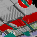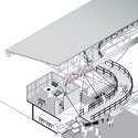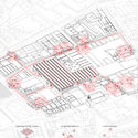 Extracto de memoria: Como estrategia de proyecto, se plantea una reconfiguración en torno al espacio público y privado de la Vega Central. Se presenta como una infraestructura de movilida durbana, que vincula directamente el traspado de insumos desde las áreas de manoobras hasta las zonas de bodegas internas y externas de la Vega. Domesticar la calle, desplazando los automóviles a un perímetro vehicular que se incrusta en el sistema únicamente en el sector de remates desplazado a un nivel bajo del galpón.
