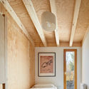 Constructivamente, la casa se sustenta sobre unos muros de entramado ligero de pino, con montantes separados para optimizar los tablero, rellenos de una doble capa de aislamiento de lana de roca y forrados por el exterior por una fachada ventilada de madera.