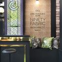 Emborracharse (de imágenes en este caso) nunca fue tan inocuo o la resaca tan leve. No obstante, para evitar cualquier posible y visual intoxicación, se optó huir de la mezcla indiscriminada de patrones y texturas, prefiriendo “maridar” estampados florales con fibras naturales, pieles, baldosas, adoquines y ladrillos cuyo colorido natural habría de destacar sobre una arquitectura interior compuesta por carpinterías, molduras, cornisas, zócalos y pilastras teñidas de un profundo negro y rematadas con brillos dorados. Por su parte, el “naming” del espacio, que atendiendo a la naturaleza textil del producto y al número del Stand acabó por sonar a “90 Fabric Street”, marcaba una pauta clara para el branding, salpicando con un sistema de imagen corporativa especialmente diseñado para la marca ficticia compuesto enteramente por un elegante juego tipográfico de fuentes de palo seco y serif en negro mate o dorado metalizado sobre las cristaleras, los rótulos de fachada, las banderolas o las barricas de roble natural que en el exterior servían como pequeñas mesas tipo cóctel en este caso idóneas para una informal pero productiva reunión.