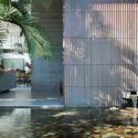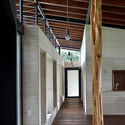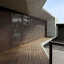 La fachada se reduce a una paleta de tres materiales que se caracterizan por su eficiencia y buen comportamiento frente a la temperatura y las condiciones climáticas de este contexto. Igualmente, son materiales técnicamente viables y conocidos en su proceso constructivo en el lugar, cuyo mantenimiento es casi nulo. El cuerpo principal de la casa (muros portantes), lleva un acabado en marmolina preparada y texturizada que se interrumpe con losas en concreto blanco a la vista. Estos elementos enmarcan unas bahías en madera teca que a modo de fachadas ventiladas ayudan a aislar térmicamente la vivienda.