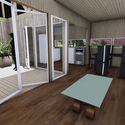 El proyecto considera capas sucesivas con diferentes responsabilidades. Una tela sombreadora que regula la radiación solar; un sobretabique que permite adaptarse a diferentes condiciones térmicas y socioculturales del usuario; un cerramiento perimetral estructurante en tabiquería de madera aislada que asegura alta resistencia térmica; un mueble perimetral continuo que ofrece almacenamiento de acuerdo a necesidades, disponiendo en la cara norte un invernadero adosado, que permite captar y acumular energía radiante para distribuirla al resto de la vivienda logrando un sistema de alta eficiencia energética