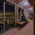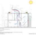 2. Envolvente apropiada para Santiago: Santiago tiene un invierno frío, corto y un verano largo y caluroso con grandes oscilaciones térmicas. Este clima induce a tomar algunas de las decisiones de diseño. El bloque de una sola crujía facilita la ventilación e iluminación natural. La fachada principal y terraza se orientan al norte. El piso de la terraza y pasillos es translúcida: deja pasar luz y protege del sol en verano. La envolvente de muro tiene aislación térmica de lana de oveja, masa térmica interior y revestimiento exterior de madera impregnada sin arsénico. Las ventanas son de PVC con doble vidrio hermético. Una de las ventanas es similar de madera impregnada. La transmitancia térmica del es un 21 % de lo recomendado por la reglamentación térmica chilena. Piso y techo son losas de hormigón armado con viguetas, losetas de poliestireno expandido y lana de oveja. Las temperaturas interiores simuladas son aceptables en verano y demandan 2000 W de calefacción. Tiene 4 paneles fotovoltaicos on grid .