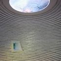 Para crear la forma orgánica del edificio mientras seguíamos usando un enfoque de baja tecnología para la construcción, usamos pequeños cortes de madera. Un fabricante de barril local proporcionó los recortes de madera de roble que fueron reciclados en el sitio. Las piezas de madera se apilan unas sobre otras en más de 40 capas, siguiendo la forma de plantillas pre-construidas. Una forma trapezoidal, insertada en la forma orgánica de la casa de té, enmarca la gran ventana. A través de la materialidad de madera de roble y cobre, la casa de té se ajusta a la vegetación circundante y se convierte en parte del jardín cultivado.