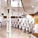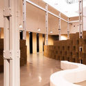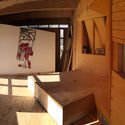 Este proyecto fue el resultado de un taller que explora las posibilidades constructivas del cartón. La intervención consiste en una estructura de cartón giratoria que envuelve los pilares, creando una serie de espacios diversos que varían en altura.