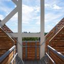 La estructura principal es un marco de columnas blancas de acero y tirantes. Se erige como una escultura en la cima de la colina. Las barandas están hechas de madera, que otorgan un buen contraste con la estructura y suavizan la apariencia.