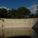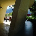 Descripción de los arquitectos: el edificio es umbral que prepara la entrada al Jardín. Su presencia sobre la esquina de Carabobo lo convierte en la primera imagen representativa del Jardín en la ciudad. Conformado por muros de concreto ocre, inclinados hacia afuera, de geometría elíptica que se desplaza para traslapar los muros y crear en el rompimiento las puertas. El piso refuerza la intensión; trabajado en una sola superficie de concreto, da continuidad a los muros que conforman el patio y contiene a su vez un espejo de agua. La pérdida de noción del límite que produce el reflejo de los muros y el cielo, concede misterio al espacio. El sonido del agua en constante circulación a lo largo de todo su borde, aísla el ruido de la ciudad. El voladizo de cubierta permite una relación con el exterior más franco, definido únicamente por la sombra.
