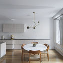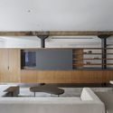 Después de destripar el espacio laberíntico anterior y dejar solo elementos estructurales clave, se planificaron zonas de servicio para crear una relación recíproca entre las zonas públicas y privadas. Las áreas de la sala de estar y cocina en el lado este se benefician de la luz natural y las vistas de las ventanas del dormitorio, en el oeste, sin molestar la privacidad de las zonas de dormitorio. Para ayudar a definir más el espacio y acomodar diversas actividades, se diseñaron una serie de accesorios integrados, como gabinetes multiusos de nogal flotante, un bar en voladizo, así como varios paneles plegables de altura completa.