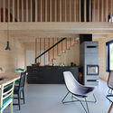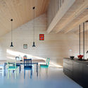 Su forma asimétrica es el resultado de la disposición funcional del interior. A pesar del tamaño limitado de la casa, se ha podido organizar una espaciosa zona diurna en la planta baja compuesta por la sala de estar, comedor y una cocina anexa con acceso directo a la terraza. La escalera ubicada en el centro separa la sala de estar del hall y de las habitaciones cerradas: el dormitorio principal, baño y aseo. El techo asimétrico permite una altura suficiente en parte del edificio para un piso adicional con altillo y dos dormitorios para invitados.