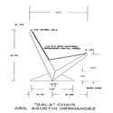La Silla Gala es un sobrio diseño a partir de rejilla de metal, se trata de una composición prismática que funciona con o sin cojines, un mueble que también puede ser para exteriores así como par interiores. La base del mueble es una cruz de láminas gruesas metálicas que recuerda una hélice o una propela, se trata del momento más dramático de la composición y que dialoga directamente con los mástiles que sostienen el respaldo, casi una estrella tridimensional.