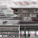 Finalmente, con la intención de exponer el trabajo de comerciantes e integrar servicios que retroalimentan al sector, en el borde del edificio se despliega una explanada, cuyo sistema desmontable de pilarización permite su mutación según las exigencias y temporalidades urbanas.