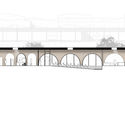 Concepto constructivo: en una primera etapa se propone una estructura de 3 x 3 metros, en el cual se ordenarán bóvedas para jerarquizar el recorrido longitudinal donde se sitúan los accesos del proyecto, generando recorridos dinámicos mediante el posicionamiento del programa (recintos-burbujas) y en el sentido transversal se posicionan los arcos para generar el vínculo con la ciudad y el cementerio de trenes.