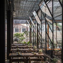 Algunos elementos, como la armadura de madera del techo existente o la copa de los árboles del jardín, situados sobre el nuevo techo medio transparente, pertenecen por tanto al lado exterior. Pueden interactuar con las villas y edificios comerciales de los alrededores para proyectar imágenes del paisaje urbano en la red agrícola. En el lado interno, todo el espacio, incluido el interior, la terraza y el jardín, todos unidos por muchos árboles de follaje dispuestos alrededor como muebles de restaurante, se ajustan cómodamente debajo de la red. Sí, finalmente, teníamos la intención de crear un amplio entorno tropical donde humanos y plantas, interiores y exteriores, interiores de edificios y paisajes urbanos se mezclaran...bajo una gran sombra.