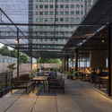 Al mismo tiempo, condicionado por su apertura y marginalidad, este volumen vacío aparece como un generoso subproducto del desarrollo urbano. Nos recuerda a la "azotea": un elemento de transición entre el edificio y la ciudad, y el espacio todavía se salva por objetivos de eficiencia. Para integrar este "vacío" adicional a las instalaciones del proyecto, instalamos la red agrícola mencionada anteriormente sobre todo el sitio. La pantalla negra medio transparente no solo se usa como un dispositivo que crea una sombra debajo, sino también como una ventana superior liviana que suaviza el brillo de un cielo y un escenario demasiado brillante.
