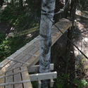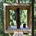 Una larga rampa de madera de aproximadamente 36 metros de largo, que repite las tortuosas líneas de caminos forestales, tiene en su final una casa de forma cúbica con 2,4 m de ancho y una terraza con chimenea, de donde se puede ver el atardecer.