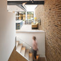 La reconfiguración de las escaleras permitió a Sketch crear una gama de ideas de almacenamiento inteligentes e innovadoras, maximizando el uso del espacio. El pasillo ahora se siente más amplio y ordenado a pesar de los desafíos de la vida familiar. En toda la casa han utilizado una serie de materiales naturales; ladrillos a la vista, aceros pintados, vidrio y madera. En la cocina y en el sótano, crearon el almacenamiento usando chapa de abedul y en el piso de arriba, agregaron un espacio de oficina, en donde la madera contrachapada del escritorio continua por las paredes laterales. Este espacio de oficina se ilumina gracias a una gran ventana en el techo inclinado.