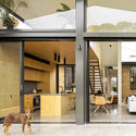 Ladrillo amarillo y metal gris son las dos estructuras distintas. Las extensiones de acristalamiento aprovechan la luz natural y promueven el enfriamiento y calentamiento pasivos, mientras que las persianas retráctiles externas atenúan la luz solar directa cuando es necesario. Una pantalla de lámina norte y un perfil trasero comprimido permiten un mayor acceso solar a la generosa masa térmica de un muro de concreto y losas de la planta baja, con un borde de terraza en voladizo y un escalón esculpido que se duplica como asientos para el disfrute del jardín.