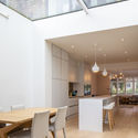Al circular a través de la casa se encuentra la cocina, ubicada en el centro de este nuevo diseño, que refleja las aspiraciones de vida de la familia – mientras que las partes naturalmente más oscuras de la planta se asignan a los espacios de servicios públicos menos utilizados. La nueva extensión trasera empuja hacia el jardín los 6 m completos permitidos bajo la aprobación previa del Reino Unido, con un juego de puertas correderas plegables de ancho completo y un gran tragaluz que permite la entrada de luz natural.