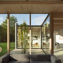 La casa está construida según un modulo único, que se repite. Este módulo se desmaterializa, se reduce a su marco exterior. Esta estrategia sustractiva destaca las cualidades táctiles de la paleta de materiales: madera sin adornos, vidrio y concreto. El diseño de la casa equilibra el uso de la fabricación modular y la artesanía de los métodos de construcción tradicionales. Con su geometría simple y el uso mínimo de materiales, la luz natural se convierte en el elemento que define el espacio, celebrando las estaciones siempre cambiantes y las extraordinarias vistas a los bosques.