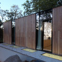 La masa de la casa principal, un bloque longitudinal que se cierne entre los árboles, se encuentra en el primer piso parcialmente incrustado en el suelo. Ambos pisos de la casa están conectados al terreno para que los usuarios no se molesten entre sí. Cada piso tiene una unidad de vivienda separada con instalaciones y salas de entretención.