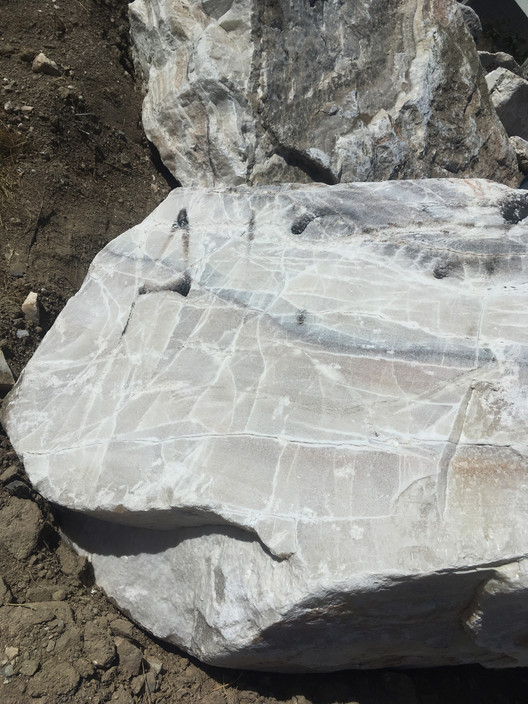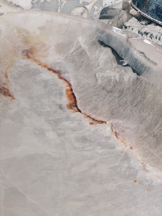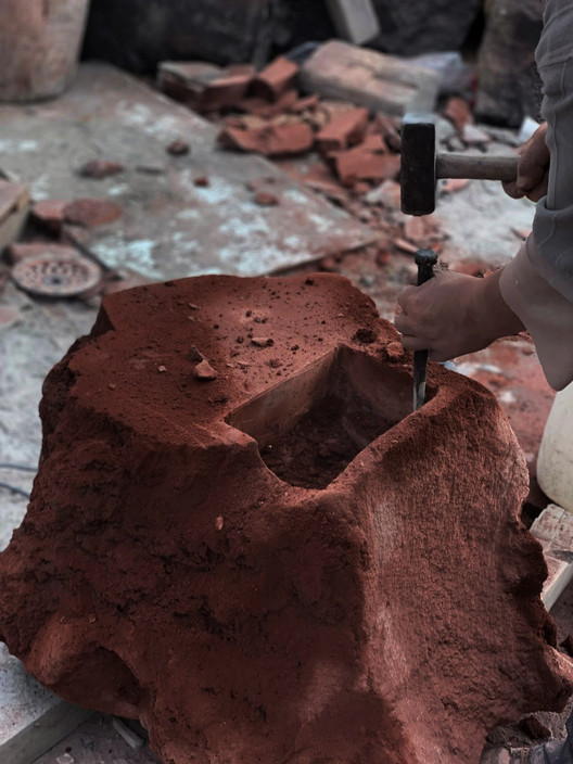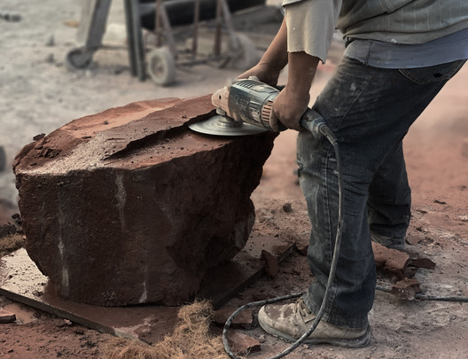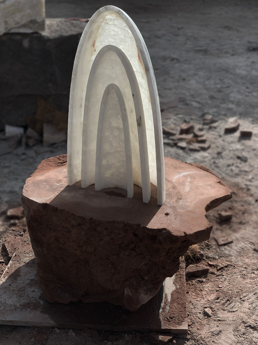Los cuatro cúpulas translúcidas están talladas a mano en piedra de ónix blanco encontrada en Puebla. La piedra preciosa venosa blanca está llena de remolinos y patrones naturales únicos de este mineral, que se encuentra en la parte superior de la piedra volcánica roja, tezontle. El tezontle se ha utilizado en México desde tiempos prehispánicos para la construcción de pirámides y templos. La luz del aura se esconde dentro de esta piedra terrosa, se dirige hacia arriba entre las cuatro capas de ónix, creando un halo de aura alrededor de las estructuras.